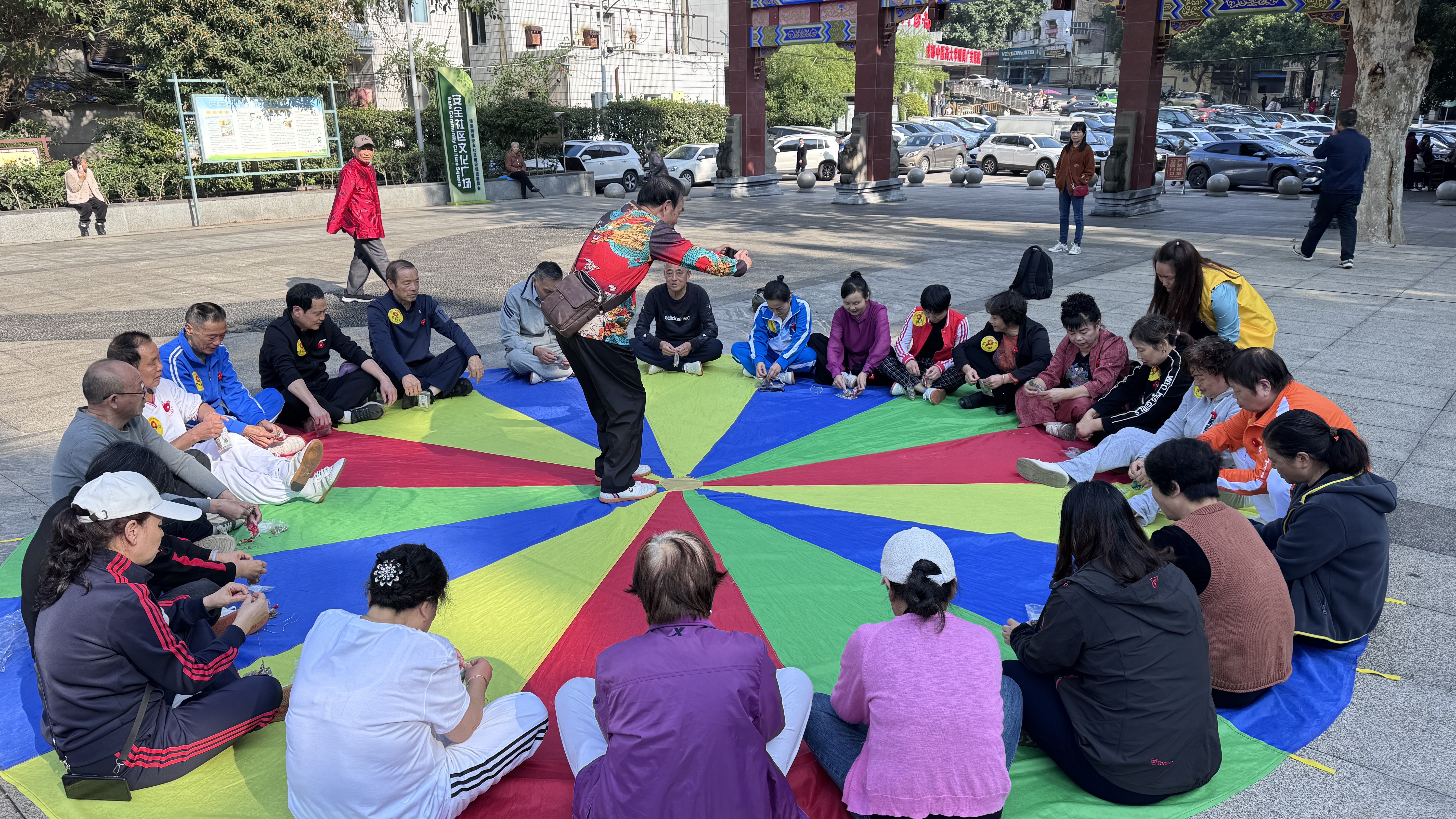 抵达终点南门广场后,大家稍作休息,纷纷与印有“今天你助老,明天老助你”“奉献爱心,服务社会送你一朵小红花”等标语的KT板合影留念,记录美好瞬间。打八段锦、跳扇子舞、制作茱萸香囊……大家不仅锻炼了身体,还体验了手工乐趣,感受传统文化的魅力。